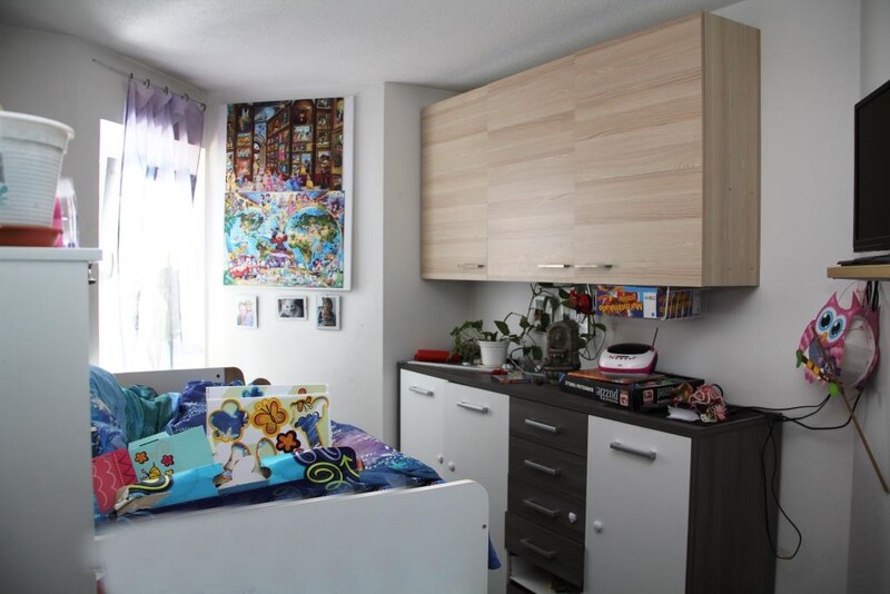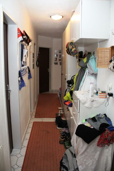 Die Wohnung hat (im Uhrzeigersinn) ein Wohnzimmer mit Essecke, eine Küche, einen Abstellraum, ein Bad, ein WC und zwei weitere Zimmer.