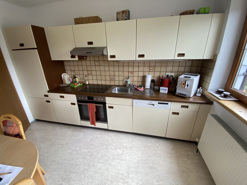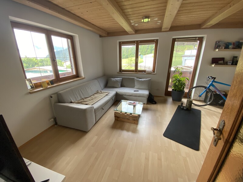 Die Räume mit teilweiser -geringfügiger- Dachschräge habe den bestimmten Flair. Zumal das sehr großzügige Wohnzimmer mit einem urgemütlichen Kachelofen und einer traumhaften Holzdecke besticht.